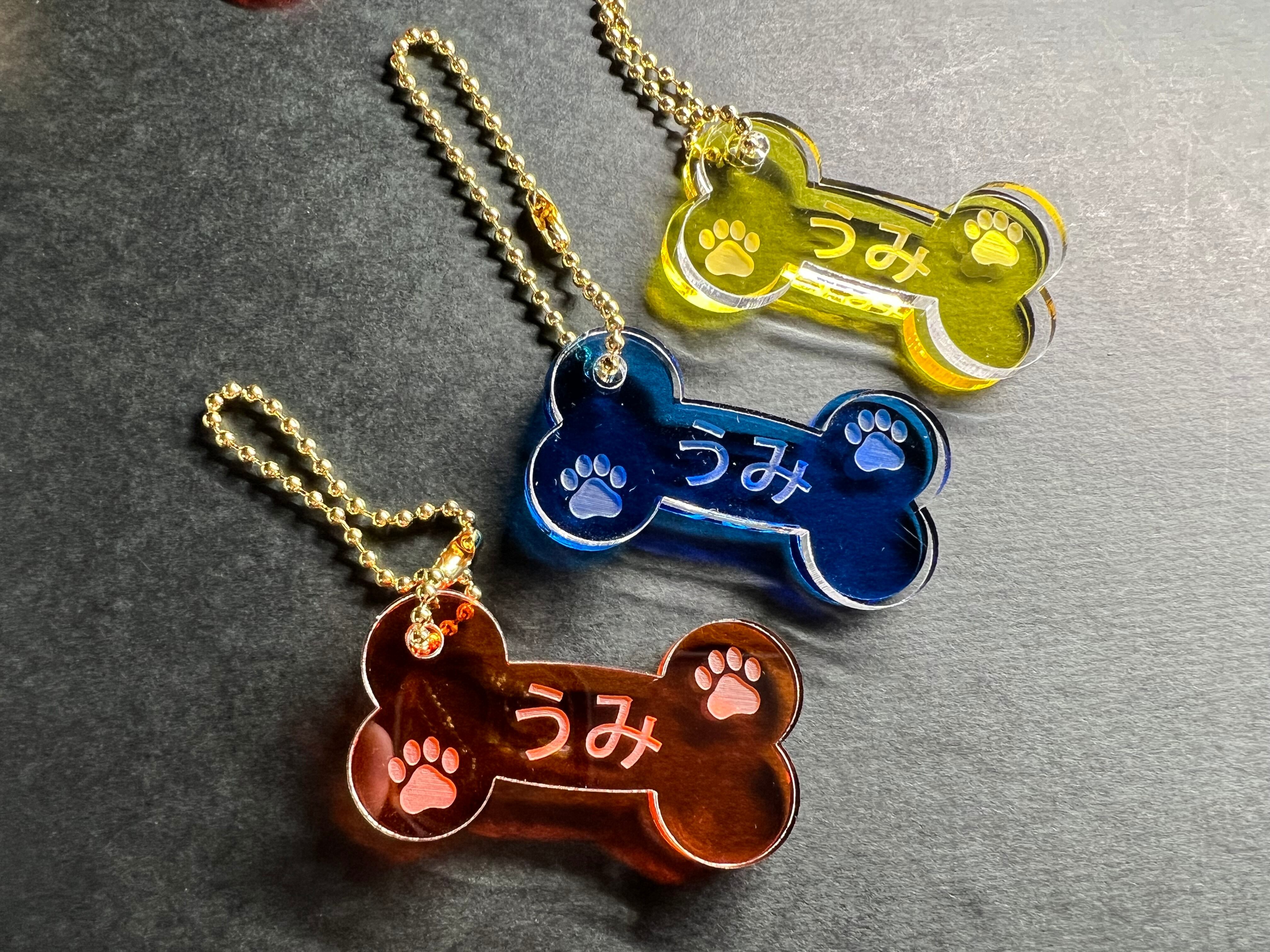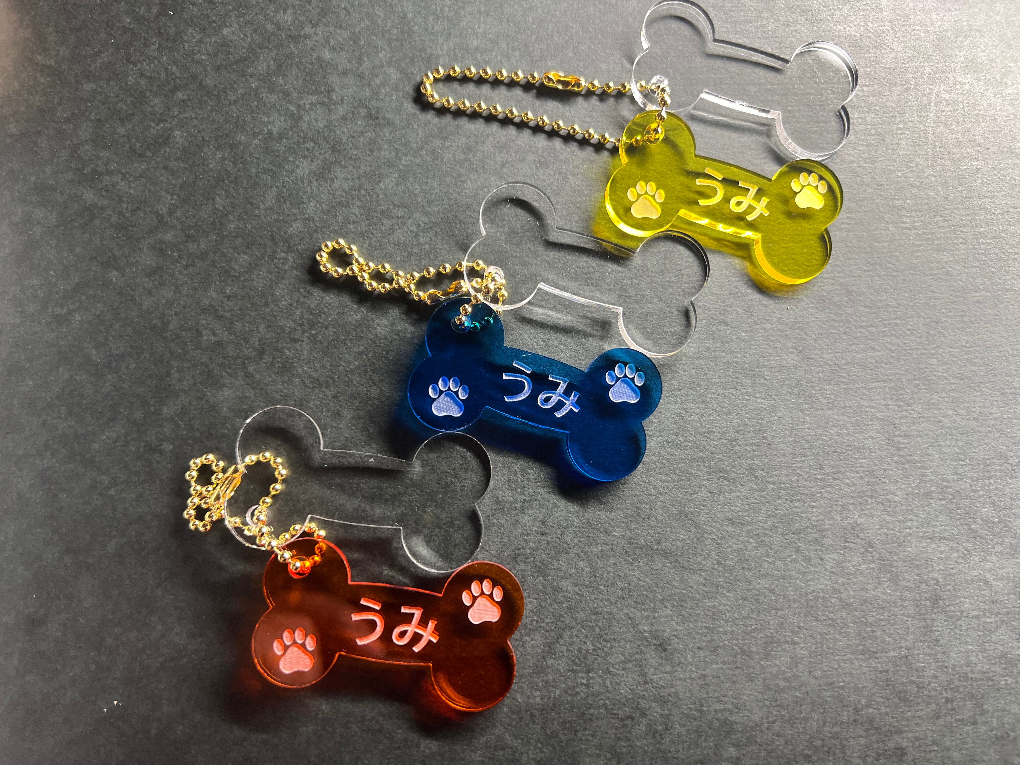 お好みのネームが入れられる可愛いホネ型のアクリルキーホルダーです。