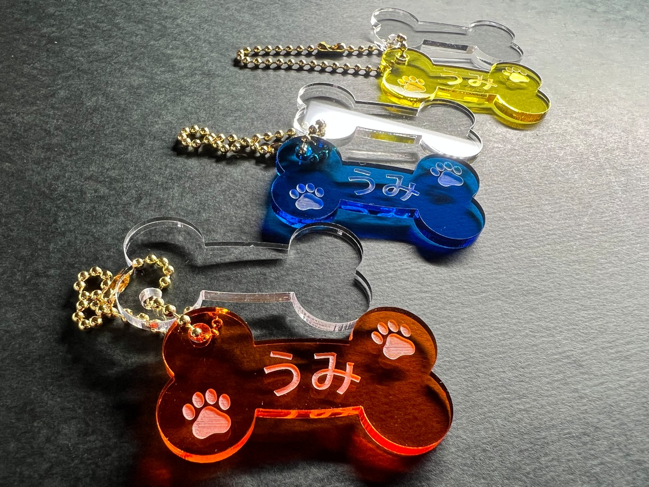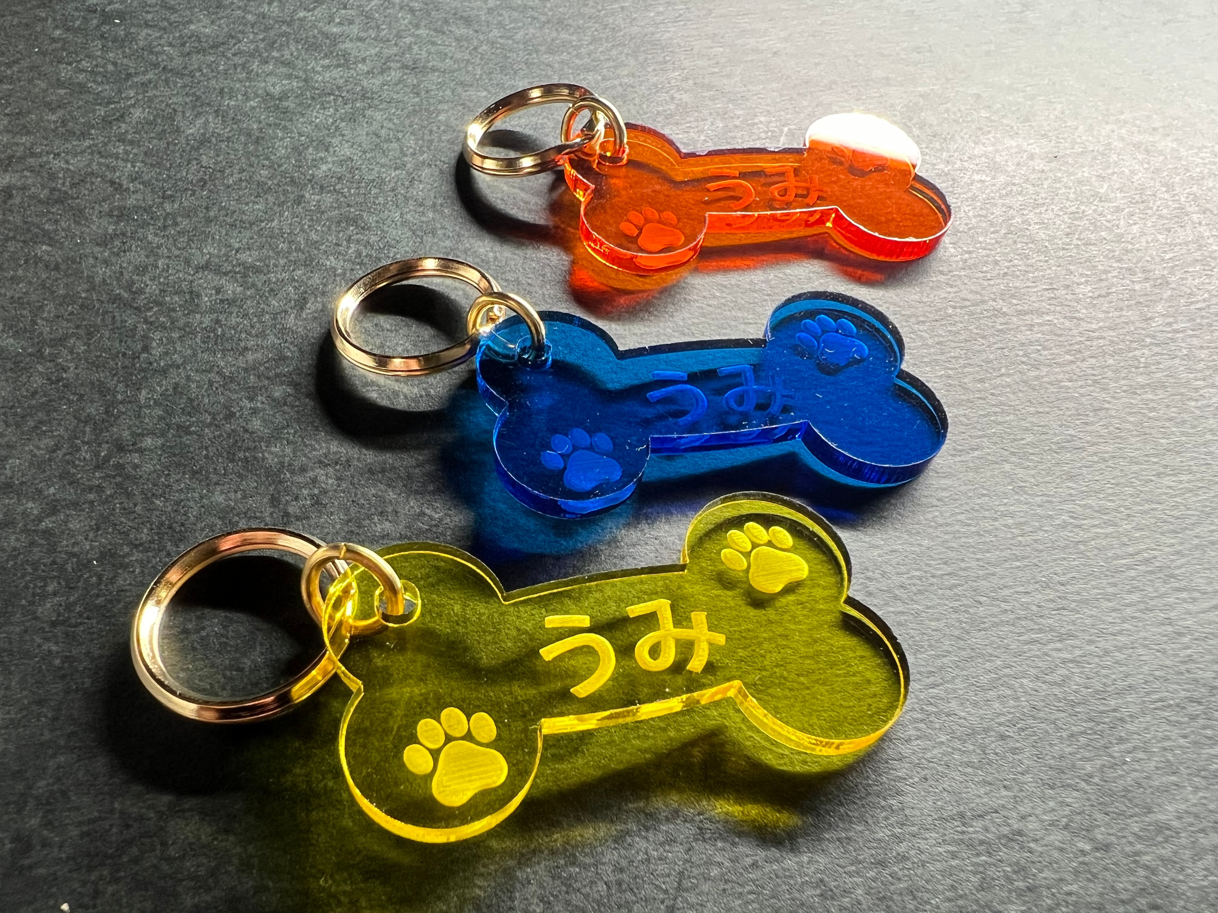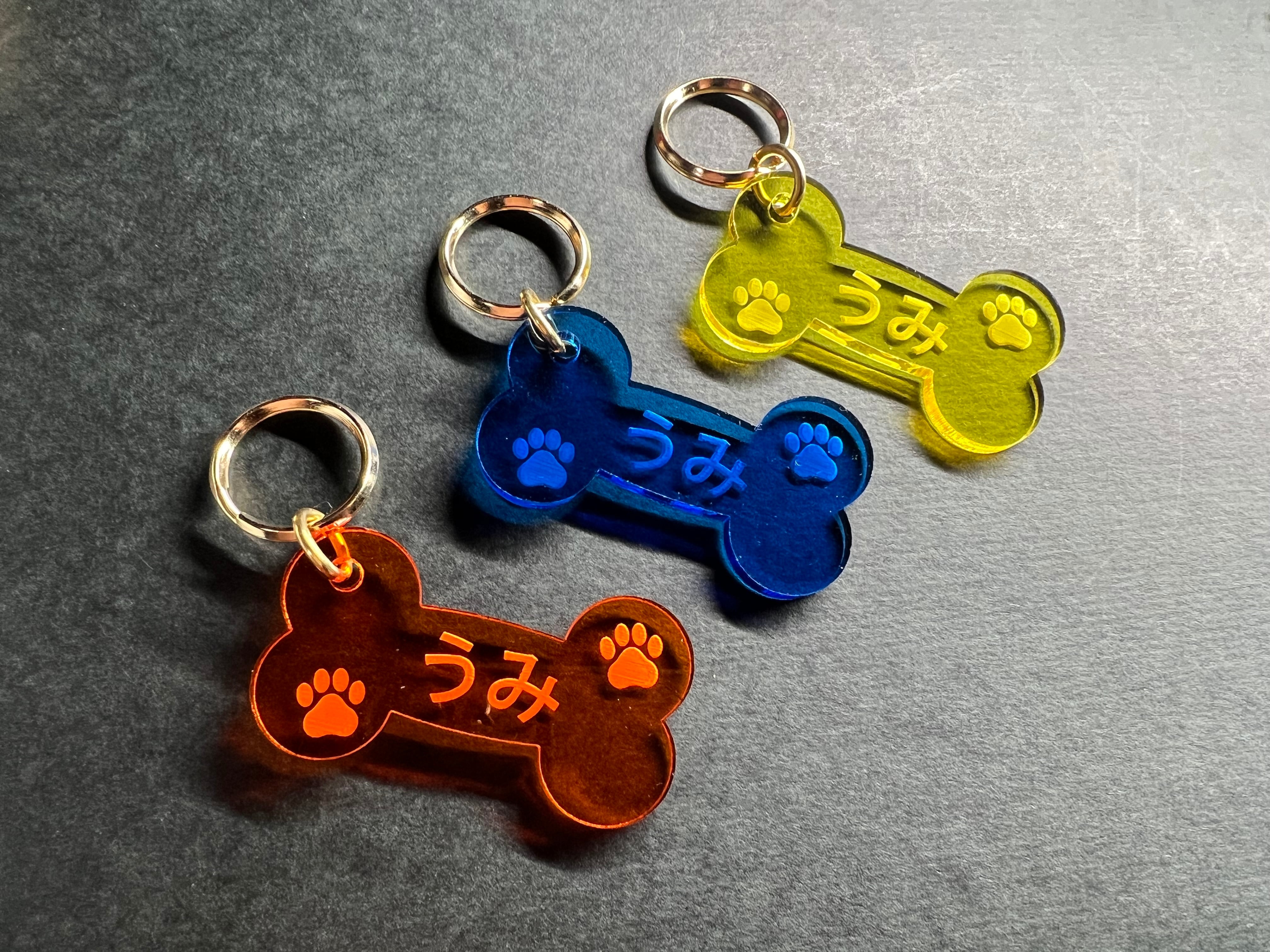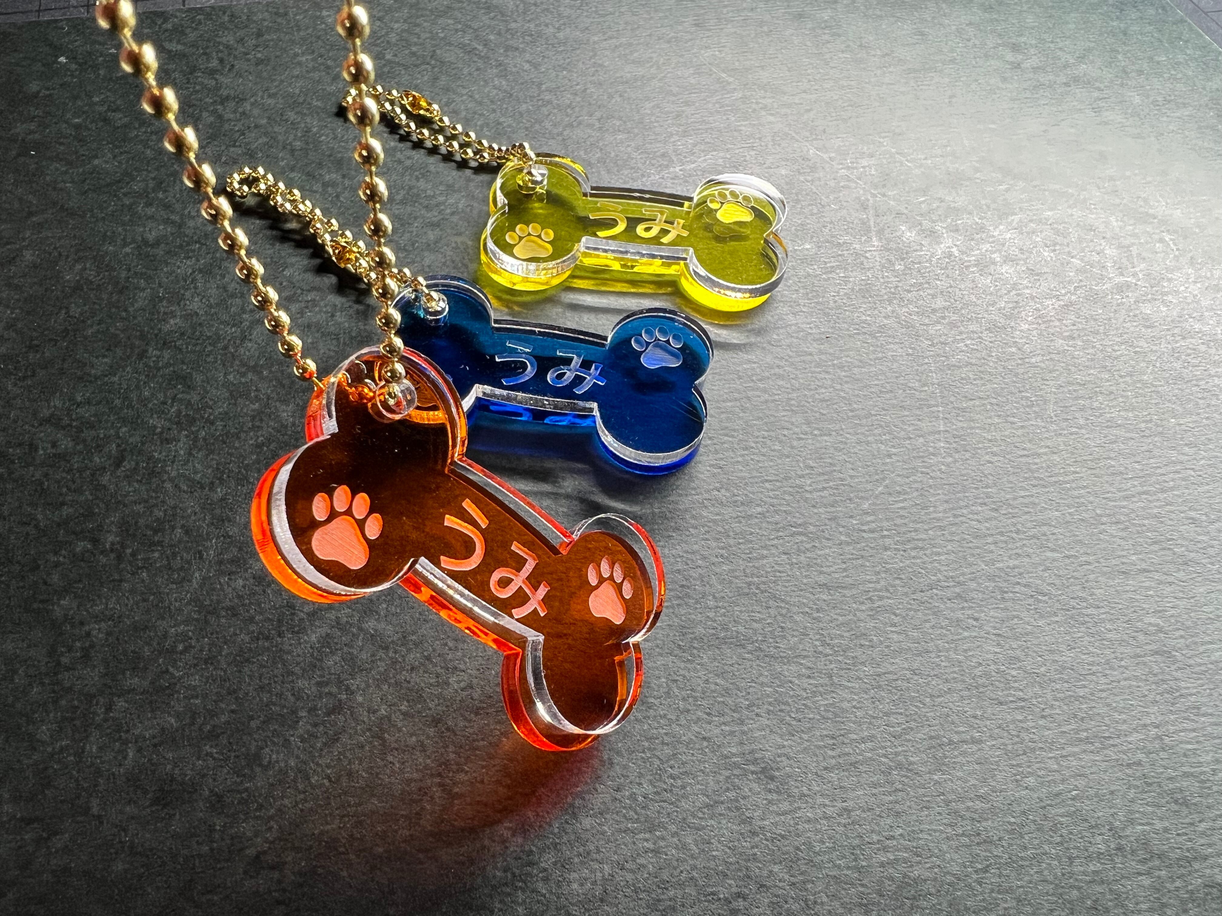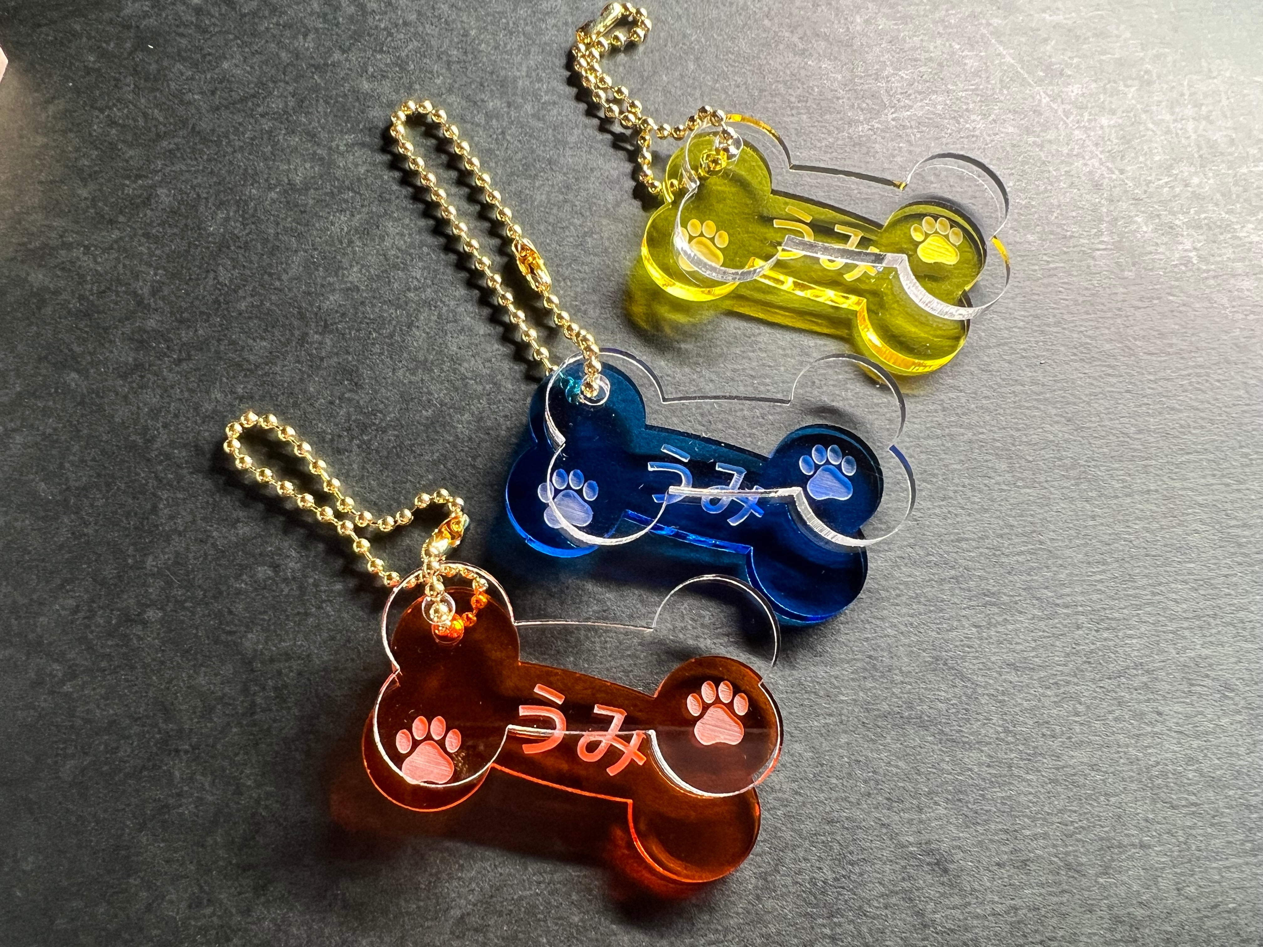 お好みのネームが入れられる可愛いホネ型のアクリルキーホルダーです。