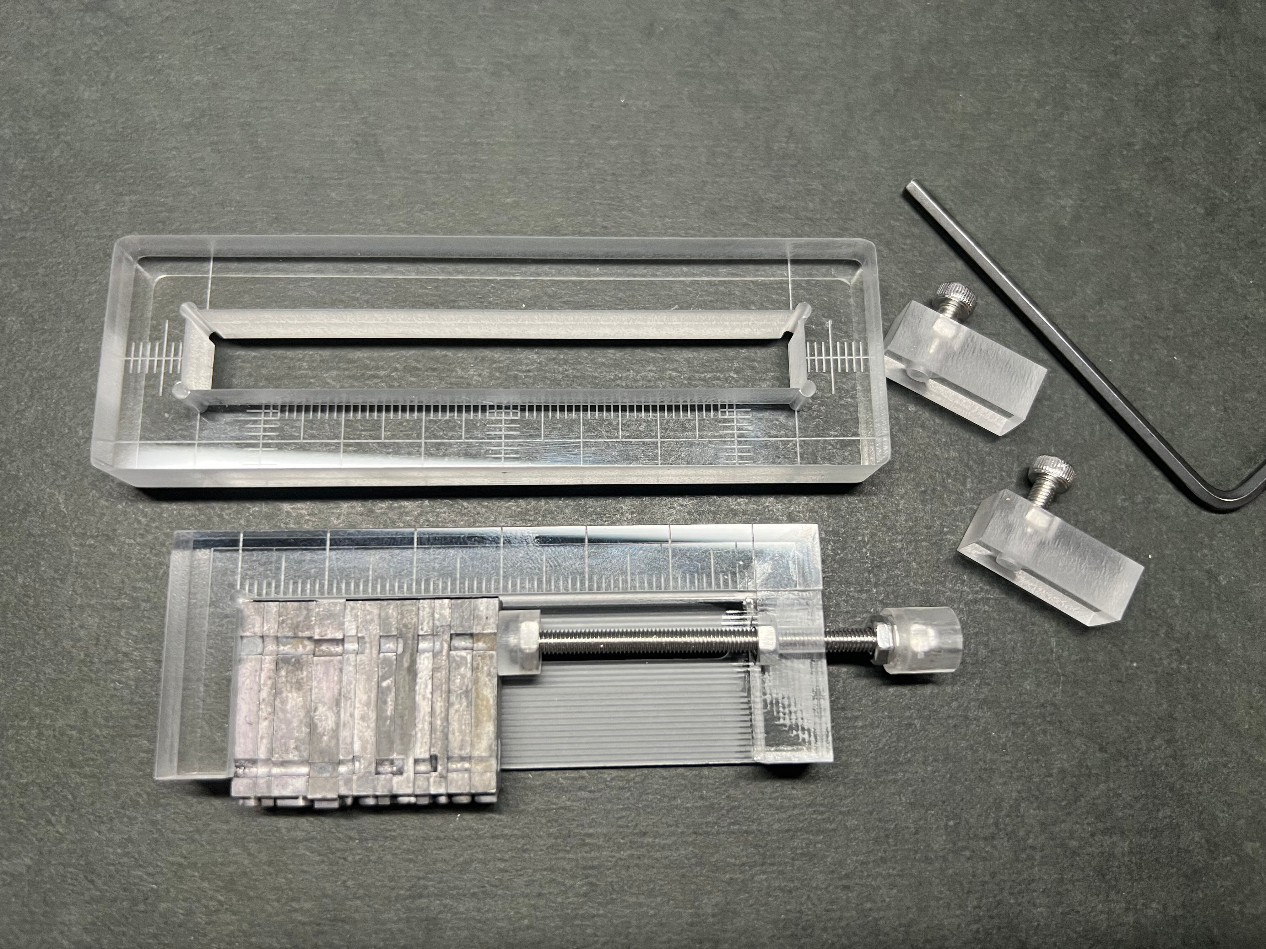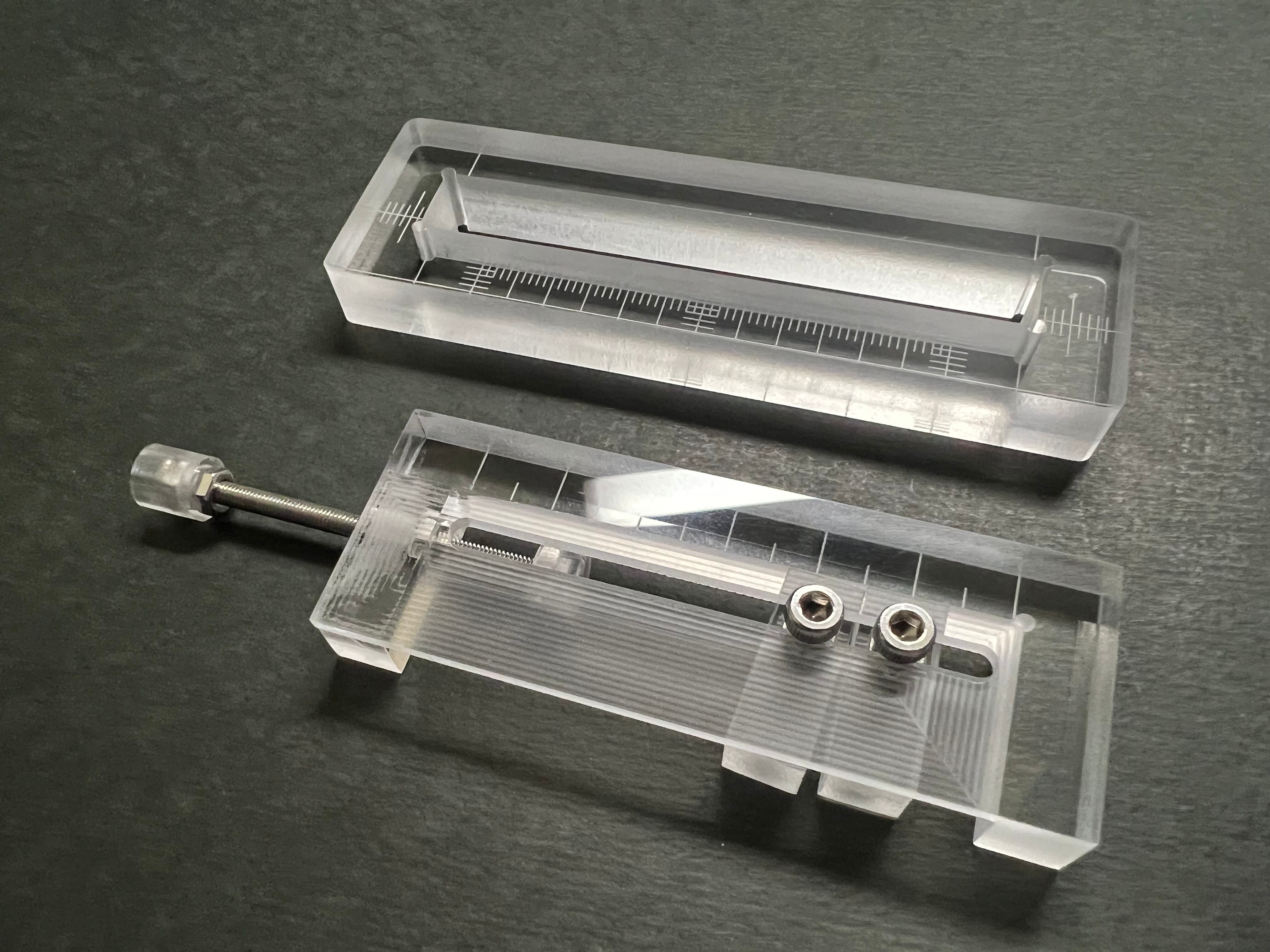 アクリル製のホルダーなので使いやすくセンター位置に合わせやすい、目盛付きなので革にも位置が合わせやすいという特徴があり押し間違いも防止。