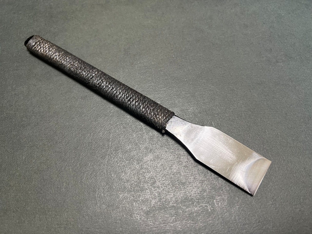 他ではまず見かけない細身のタイプで、持ち手は麻紐巻きで質感が良く、また刃を寝かせられる為、大変漉きやすくなっております。