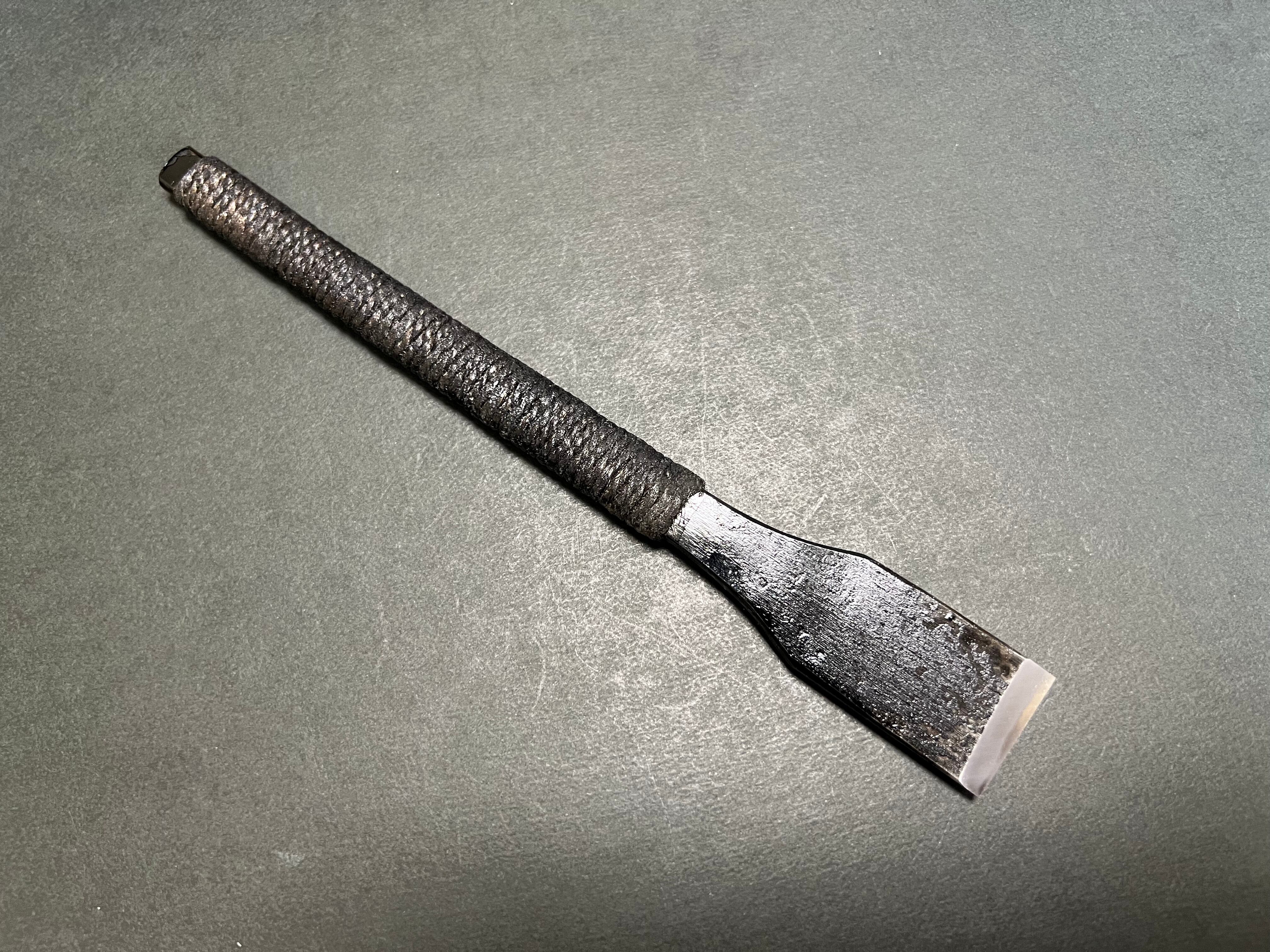 他ではまず見かけない細身のタイプで、持ち手は麻紐巻きで質感が良く、また刃を寝かせられる為、大変漉きやすくなっております。